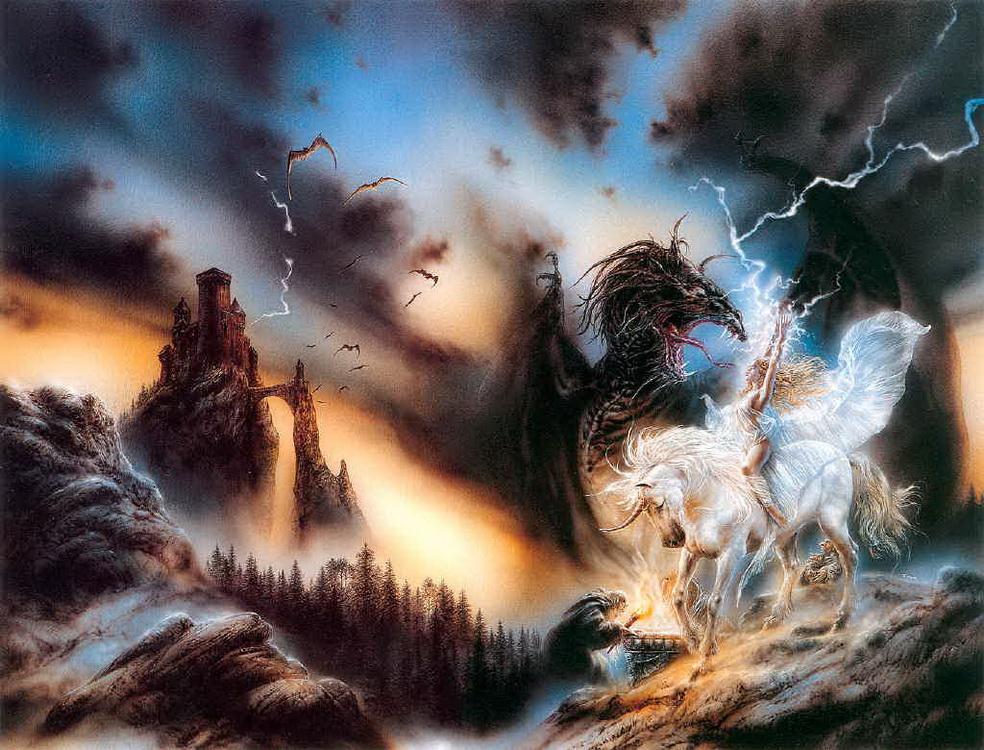 Fast forward to 2012, he has published 25 books, re-released in different languages and collector editions, and his images have been put on anything it can be placed on (t-shirts, mouse pads, mugs, posters, etc.). He’s designed a collector card series, tarot card set and sculptures, as well as the cover art for video games and musician’s albums. Along with Romulo Royo, he painted the ceiling of a dome in a Russian castle, making his personal version of the Sistine Chapel.
